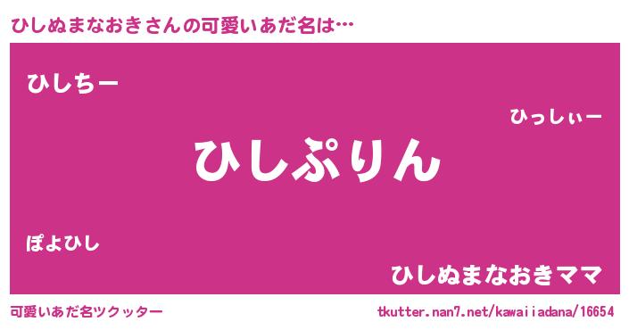 | 男性向けラノベタイトル風あだ名 | 『ひしぬまなおき~年齢イコール彼女いない歴の魔法使い~』 |