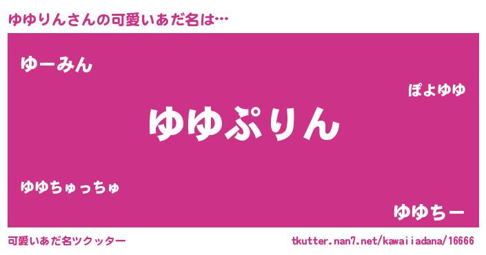 | 男性向けラノベタイトル風あだ名 | 『ゆゆりん~年齢イコール彼女いない歴の魔法使い~』 |
