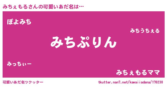 | 男性向けラノベタイトル風あだ名 | 『みちぇもる~年齢イコール彼女いない歴の魔法使い~』 |