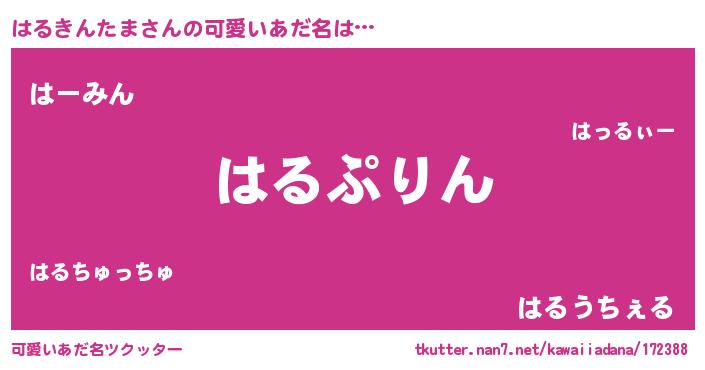 | 男性向けラノベタイトル風あだ名 | 『はるきんたま~年齢イコール彼女いない歴の魔法使い~』 |