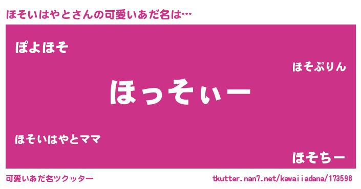 | 男性向けラノベタイトル風あだ名 | 『ほそいはやとの嫁は女の子じゃないと思った?』 |