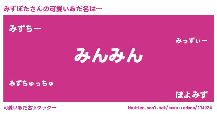 | 男性向けラノベタイトル風あだ名 | 『みずぽたの憂鬱』『魔弾の王とみずぽた』 |