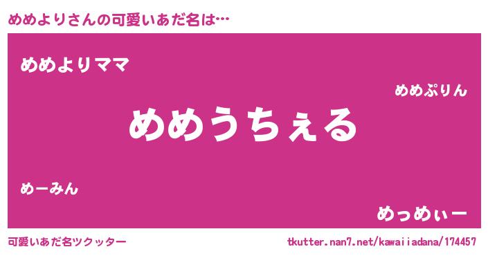 | 男性向けラノベタイトル風あだ名 | 『Re:めめよりから始める異世界生活』 |