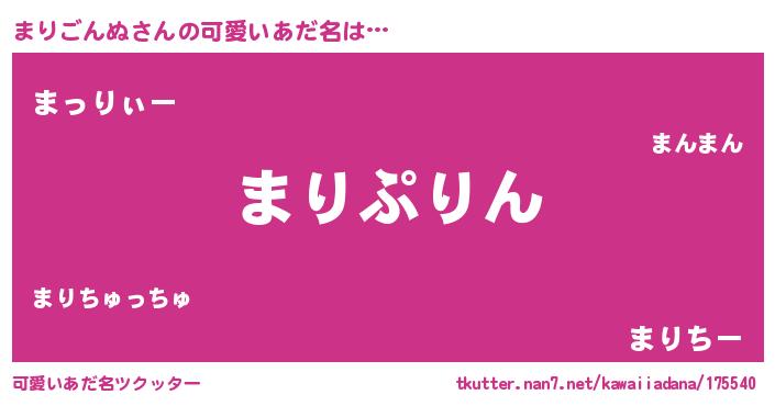 | 女子向けラノベタイトル風あだ名 | 『まりごんぬの玉の輿計画!』 |