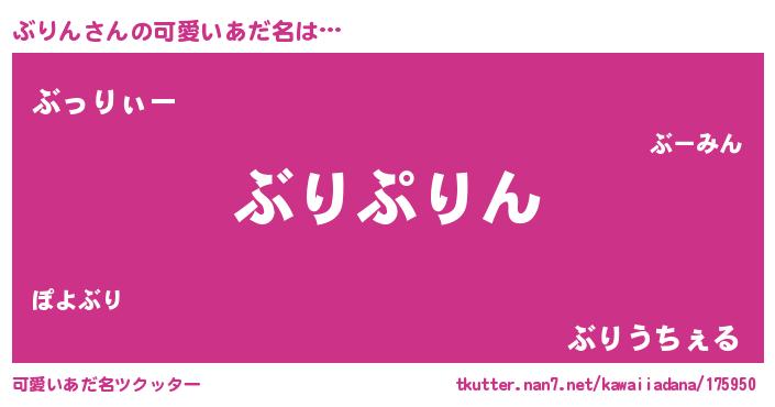 | 男性向けラノベタイトル風あだ名 | 『ぶりん~年齢イコール彼女いない歴の魔法使い~』 |