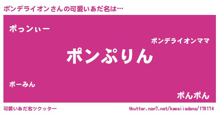 | 女子向けラノベタイトル風あだ名 | 『ポンデライオンの玉の輿計画!』 |