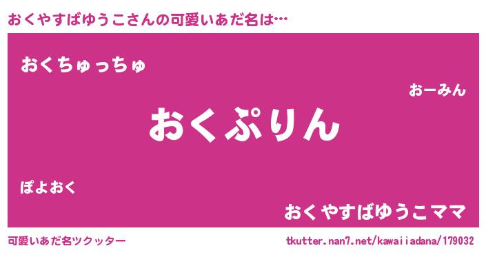 | 男性向けラノベタイトル風あだ名 | 『おくやすばゆうこ~年齢イコール彼女いない歴の魔法使い~』 |
