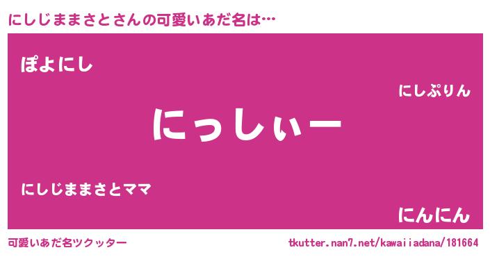 | 男性向けラノベタイトル風あだ名 | 『にしじままさとの嫁は女の子じゃないと思った?』 |