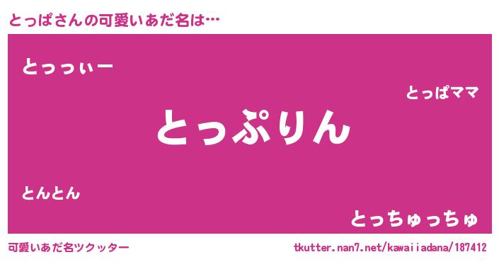| 女子向けラノベタイトル風あだ名 | 『とっぱの玉の輿計画!』『とっぱ恋絵巻』 |