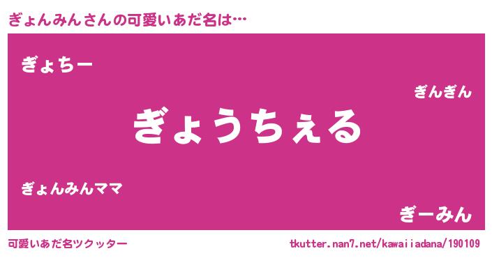 | 男性向けラノベタイトル風あだ名 | 『Re:ぎょんみんから始める異世界生活』 |