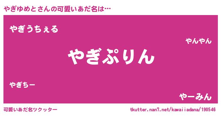 | 男性向けラノベタイトル風あだ名 | 『やぎゆめと~年齢イコール彼女いない歴の魔法使い~』 |
