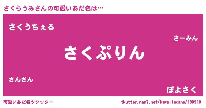 | 男性向けラノベタイトル風あだ名 | 『さくらうみ~年齢イコール彼女いない歴の魔法使い~』 |