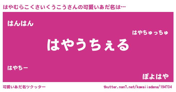 | 女子向けラノベタイトル風あだ名 | 『はやむらこくさいくうこうなんてお断りですっ。』 |