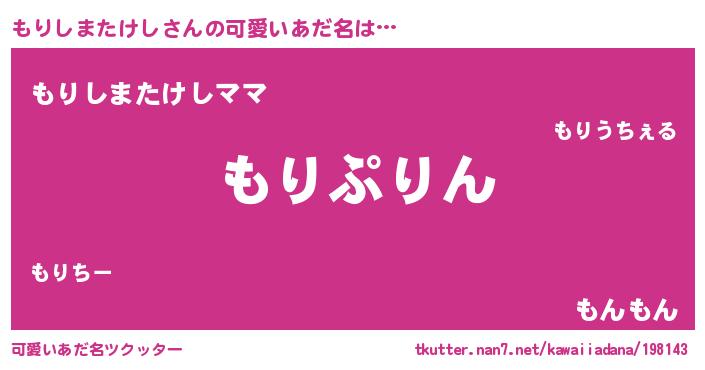 | 男性向けラノベタイトル風あだ名 | 『もりしまたけし~年齢イコール彼女いない歴の魔法使い~』 |