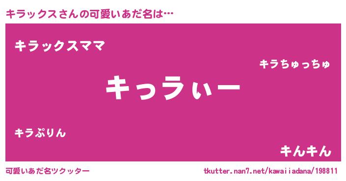 | 男性向けラノベタイトル風あだ名 | 『キラックスの嫁は女の子じゃないと思った?』 |