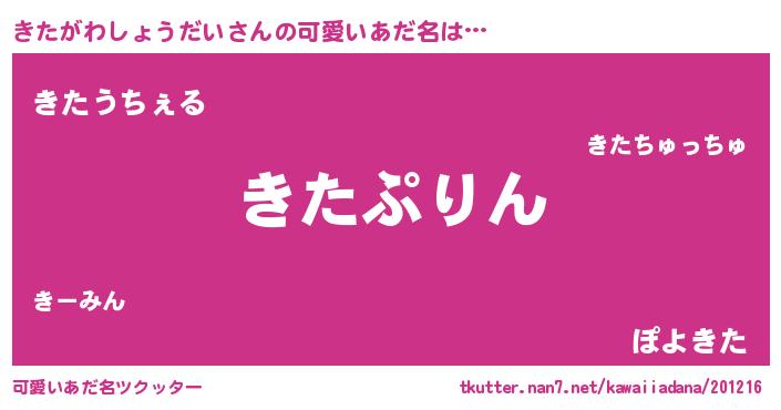 | 男性向けラノベタイトル風あだ名 | 『きたがわしょうだい~年齢イコール彼女いない歴の魔法使い~』 |