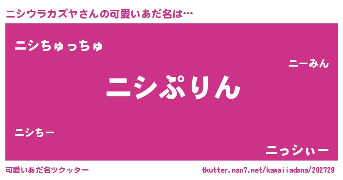 | 男性向けラノベタイトル風あだ名 | 『ニシウラカズヤ~年齢イコール彼女いない歴の魔法使い~』 |