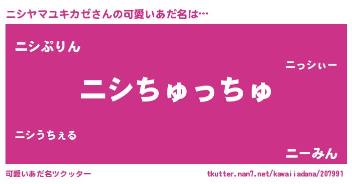 | 女子向けラノベタイトル風あだ名 | 『ニシヤマユキカゼ夫妻のなれそめ』 |