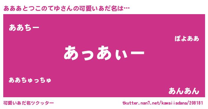 | 男性向けラノベタイトル風あだ名 | 『あああとつこのてゆの嫁は女の子じゃないと思った?』 |