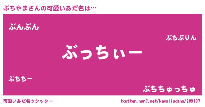 | 男性向けラノベタイトル風あだ名 | 『ぶちやまの嫁は女の子じゃないと思った?』 |