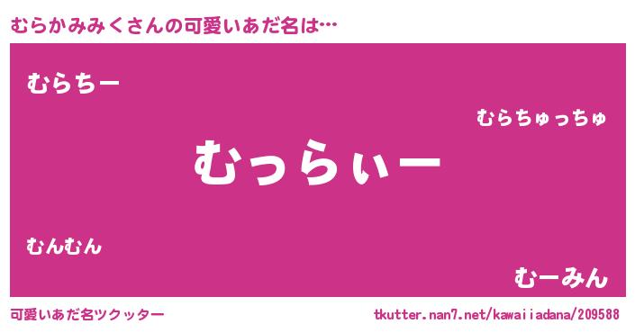 | 女子向けラノベタイトル風あだ名 | 『むらかみみくの卵を拾いまして』 |