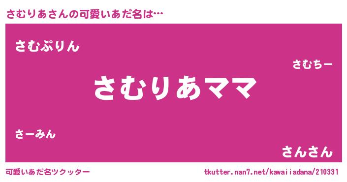 | 男性向けラノベタイトル風あだ名 | 『さむりあという概念が存在しない退屈な世界 』 |