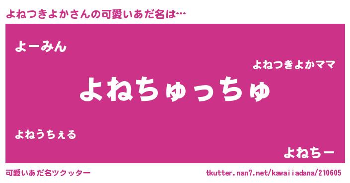 | 女子向けラノベタイトル風あだ名 | 『よねつきよか夫妻のなれそめ』 |