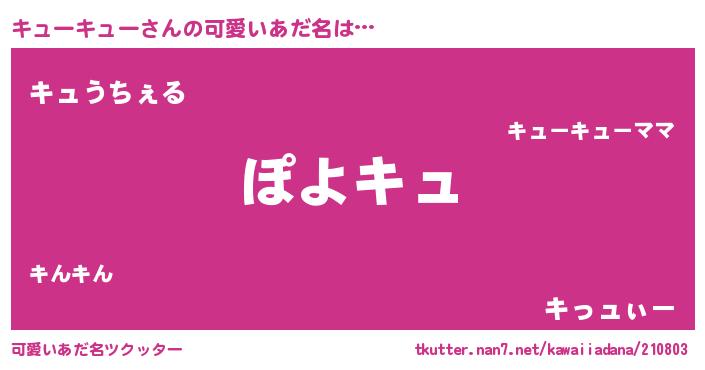 | 男性向けラノベタイトル風あだ名 | 『この素晴らしい世界にキューキューを!』 |