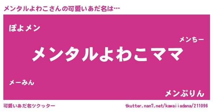 | 男性向けラノベタイトル風あだ名 | 『メンタルよわこという概念が存在しない退屈な世界 』 |