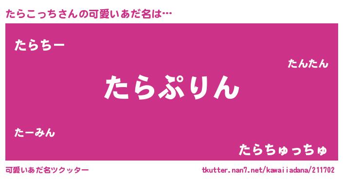 | 女子向けラノベタイトル風あだ名 | 『たらこっちの玉の輿計画!』 |