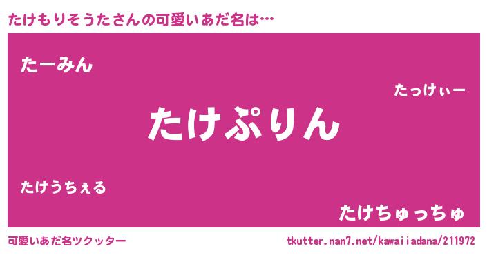 | 男性向けラノベタイトル風あだ名 | 『たけもりそうた~年齢イコール彼女いない歴の魔法使い~』 |