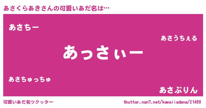 | 男性向けラノベタイトル風あだ名 | 『あさくらあきの嫁は女の子じゃないと思った?』 |