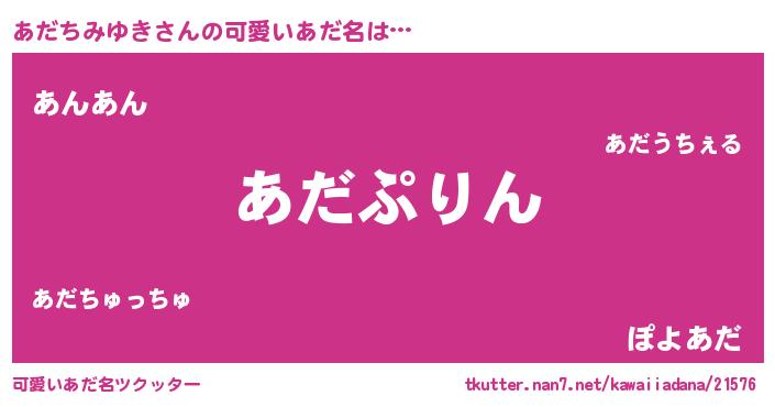 | 男性向けラノベタイトル風あだ名 | 『あだちみゆき~年齢イコール彼女いない歴の魔法使い~』 |