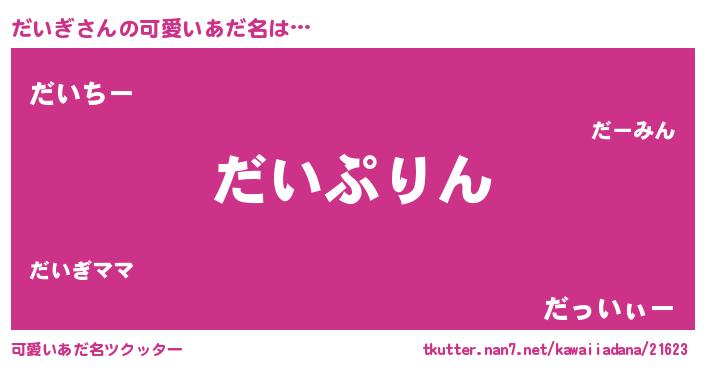 | 男性向けラノベタイトル風あだ名 | 『だいぎ~年齢イコール彼女いない歴の魔法使い~』 |