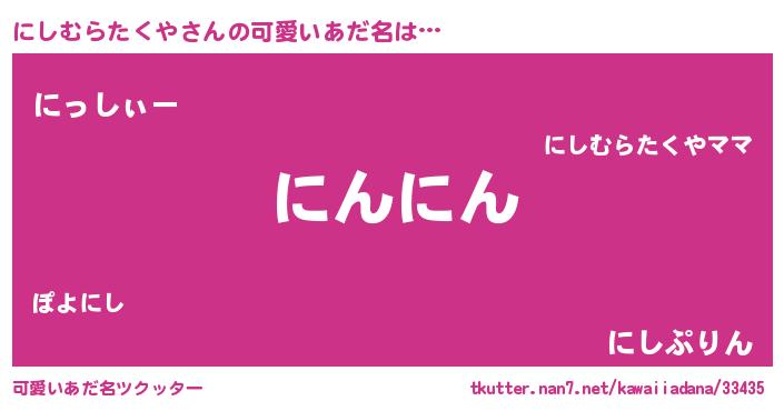 | 恥ずかしいあだ名 | 『プリティーにしむらたくや』『にしちん』 |