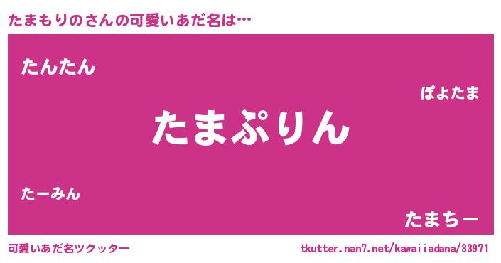 | 男性向けラノベタイトル風あだ名 | 『たまもりの~年齢イコール彼女いない歴の魔法使い~』 |