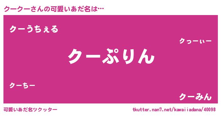 | 男性向けラノベタイトル風あだ名 | 『クークー~年齢イコール彼女いない歴の魔法使い~』 |