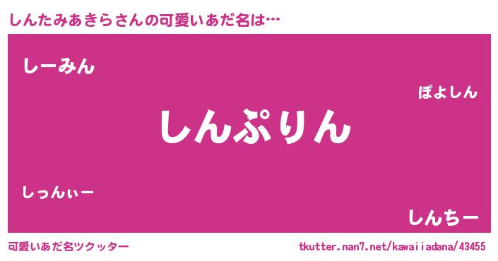 | 男性向けラノベタイトル風あだ名 | 『しんたみあきら~年齢イコール彼女いない歴の魔法使い~』 |