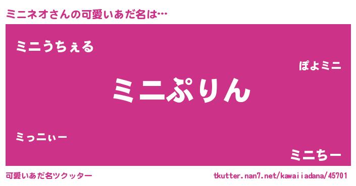 | 男性向けラノベタイトル風あだ名 | 『ミニネオ~年齢イコール彼女いない歴の魔法使い~』 |