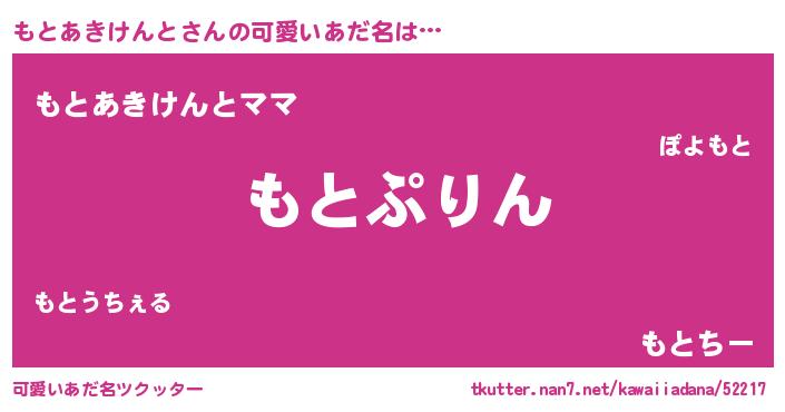 | 男性向けラノベタイトル風あだ名 | 『もとあきけんと~年齢イコール彼女いない歴の魔法使い~』 |