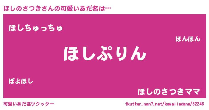 | 男性向けラノベタイトル風あだ名 | 『ほしのさつき~年齢イコール彼女いない歴の魔法使い~』 |