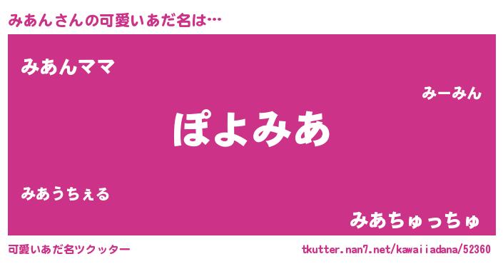 | ヘコむあだ名 | 『みあん(小並感)』『みあを』『豆乳』 |