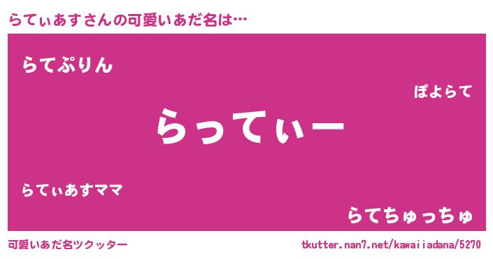 | 男性向けラノベタイトル風あだ名 | 『らてぃあすの嫁は女の子じゃないと思った?』 |
