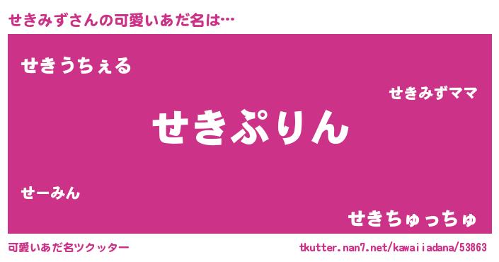 | 男性向けラノベタイトル風あだ名 | 『せきみず~年齢イコール彼女いない歴の魔法使い~』 |