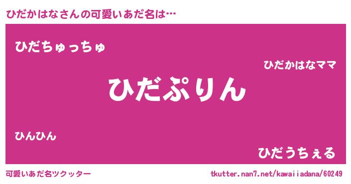 | 男性向けラノベタイトル風あだ名 | 『ひだかはな~年齢イコール彼女いない歴の魔法使い~』 |