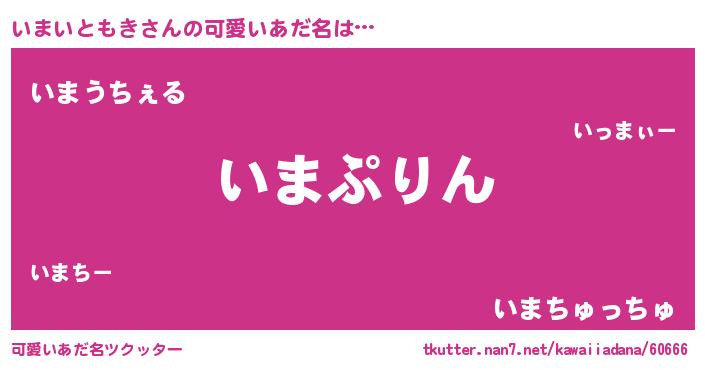 | 男性向けラノベタイトル風あだ名 | 『いまいともき~年齢イコール彼女いない歴の魔法使い~』 |