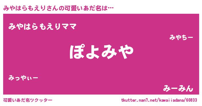 | ヘコむあだ名 | 『みやはらもえり(小並感)』『豆乳』 |