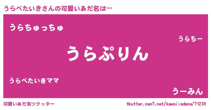 | 女子向けラノベタイトル風あだ名 | 『うらべたいきの玉の輿計画!』 |