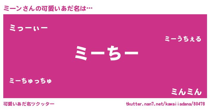 | 女子向けラノベタイトル風あだ名 | 『ミーンの雑貨屋さん』『ミーン恋絵巻』 |