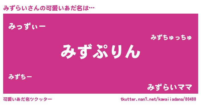 | 男性向けラノベタイトル風あだ名 | 『みずらい~年齢イコール彼女いない歴の魔法使い~』 |